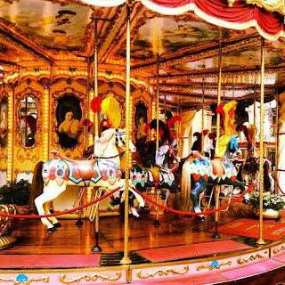 It’s small for a carousel with only twenty plumed horses with plenty of space in between. This, according to Carlo Picci, allows plenty of room between horses for mothers to stand beside their bambini while the horses go up and down and sway back and forth. The carousel also has two gilded “king’s carriages” one of which is under a gilded crown with red and green gems.